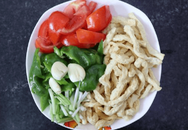 第二步:处理食材,青椒和大蒜切片,小葱的白色部分切开,番茄切成块。准备好炸,在锅中放入适量的油,将葱花炒香。加入炸豆腐和1茶匙豆瓣酱,搅拌均匀,加入少许水,焖煮。