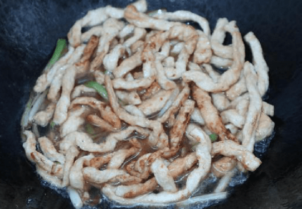 今天的菜很特别。特别的是它的配菜,包括豆腐丝。这豆腐丝是油炸的,味道鲜美。把它和猪肉一起炒很好吃。