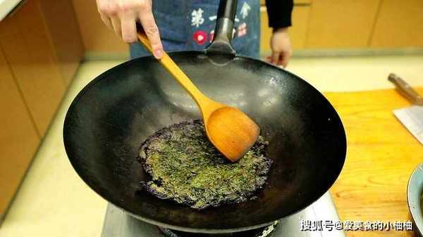 准备一整块紫菜,直接放锅里煸一下。把水分煸干的同时,激发出香味。像这样有点黄兰兰类,就差不多了。