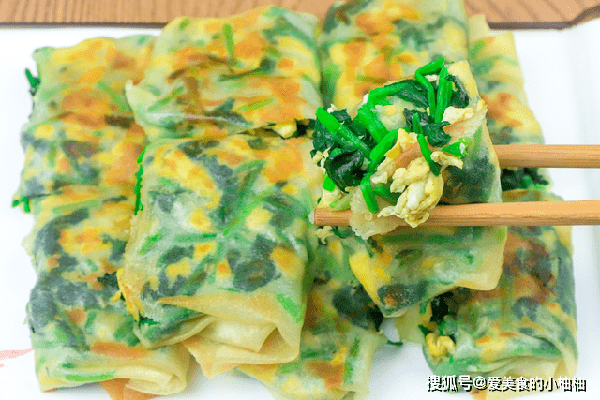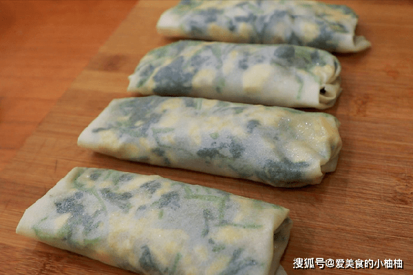 饼皮可以自己烙,也可以用现成的春卷皮,两张摞一起,放在调好的菠菜馅,然后卷起来,做成菠菜盒子的生坯。