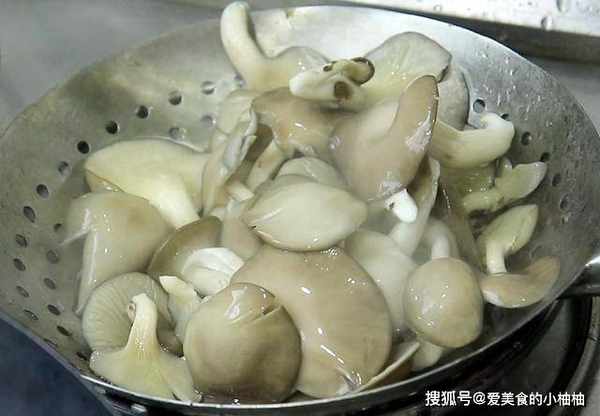 锅内烧水,加入少许食盐和鸡粉入底味,放入一点植物油,防止平菇中的营养成分流失,水烧开以后把平菇放入锅中,焯水1分钟左右,平菇变软以后倒出,快速过一下凉水控水备用。