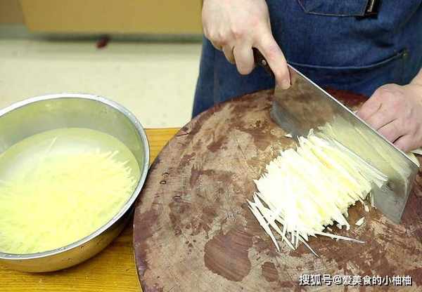 把胡萝卜、土豆、莲菜都削去外皮,把土豆切成细丝用水泡上,莲菜也切成丝,和土豆放在一起防止氧化变黑,胡萝卜也切成细丝。