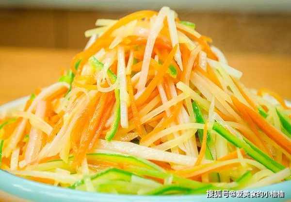 烧半锅开锅,加入少许食盐增加底味,淋入植物油锁住营养保持鲜亮的色泽,先放入胡萝卜丝汆烫10秒钟,再放入土豆和莲菜继续焯烫10秒钟,最后放入青椒稍微烫一下立即倒出来,用凉水冲洗过凉,这样吃起来才清脆。