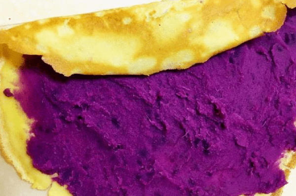 用不粘锅做蛋饼,你可以事半功倍。紫薯蒸熟后压成泥状,然后均匀地铺在蛋饼上。你做的那一刻味道好极了。