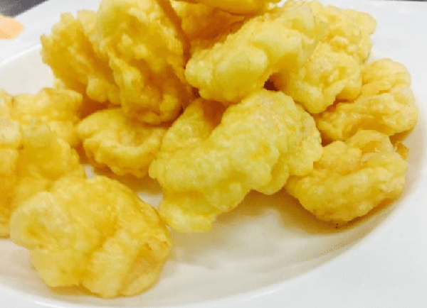 它不应该太薄。咸虾应该在糊里滚。(这是虾的糊。将虾裹成一圈,炸后会很脆。)