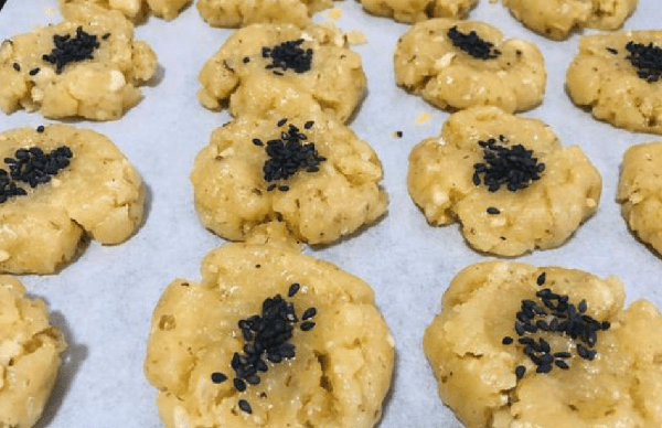 准备所需食材:鸡蛋1个,糖粉20克,植物油100克,核桃仁适量,低筋面粉220克,黑芝麻适量。