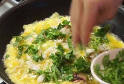 摇动锅子,使鸡蛋摊铺均匀,加入蟹肉,撒上香菜。