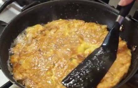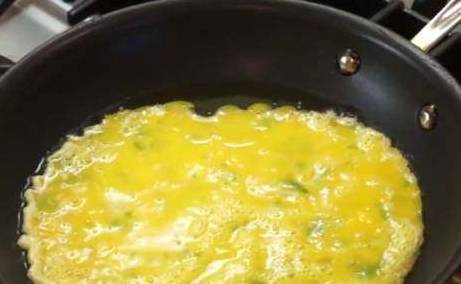 不粘锅烧热,放入油,油冒烟后,倒入蛋液。