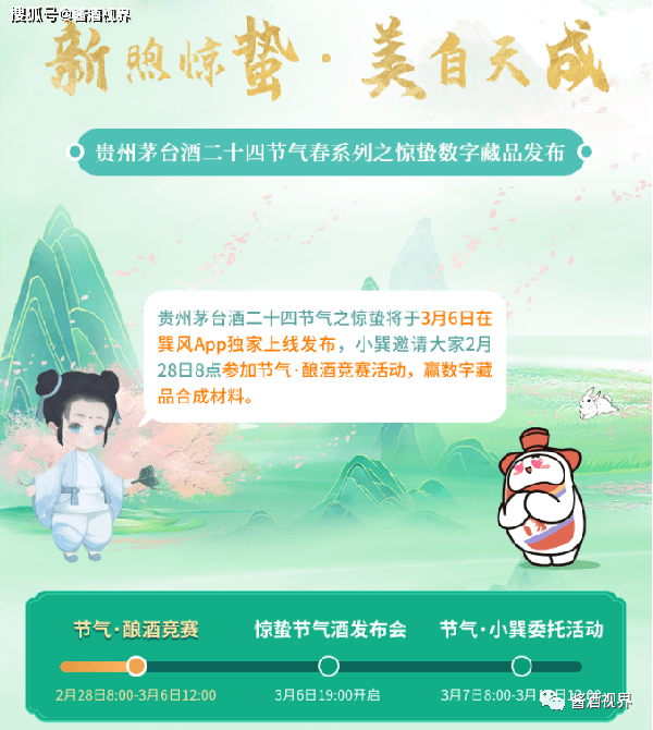 据巽风数字世界官微消息,2月28日8点贵州茅台酒二十四节气春系列之惊蛰活动开启,本活动共分为三个阶段,分别为“节气·酿酒竞赛”、“惊蛰节气酒发布会”、“节气·小巽委托活动”。据介绍,用户在三个阶段完成各项任务或者在“交易行”中与其他用户用元贝进行兑换,最多可获得“新醅”、“新煦”、“天成”三个系列500ml和100mI两种规格共6个数字藏品,行权后可购买“贵州茅台酒二十四节气之惊蛰”实物产品。