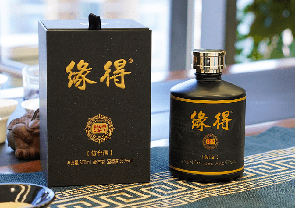 缘得得仿台酒产于贵州茅台镇,属于酱香型白酒。酿造一年,工艺复杂,季节性强。端午节踩曲,重阳下沙,取酒后窖藏三年以上。