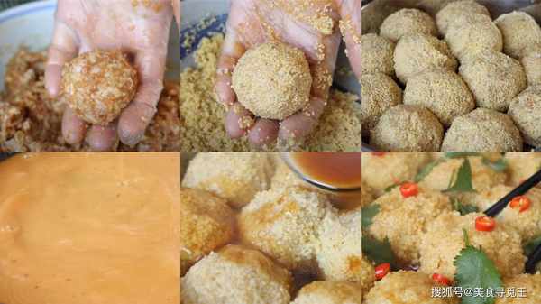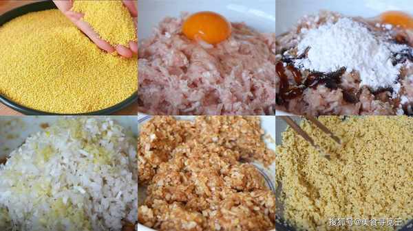 5、把调好的肉馅,戴上一次性手套,团成一个个大小均匀的肉丸,用手来回摔打一下,这样肉馅更劲道一些,然后放入到小米中,均匀的裹上一层小米,最后用手攥紧一些。