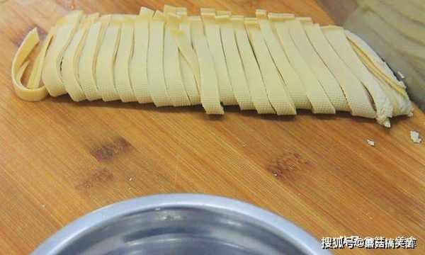 豆腐皮两张卷在一起,切成豆腐丝,放在盆中。