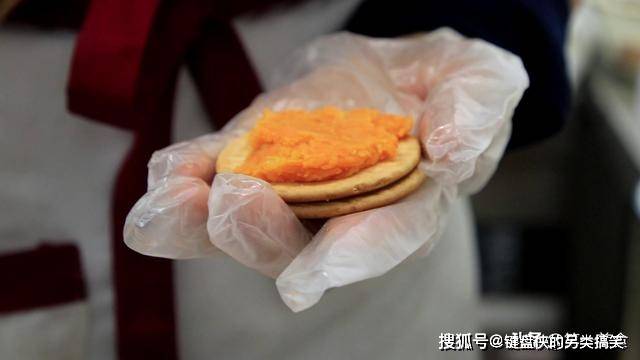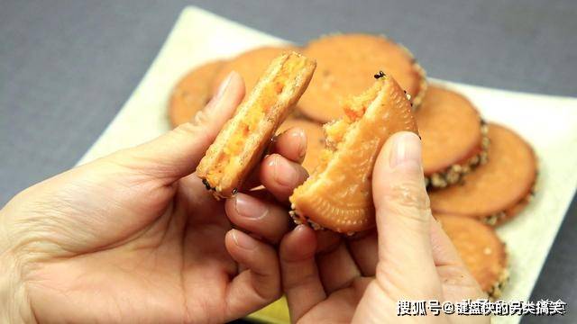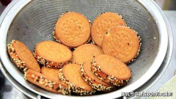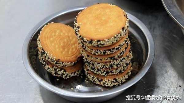 3.在超市买的饼干一包,取出两片,中间放入红薯泥,用手按压紧实以后在饼干上面裹上黑白芝麻,裹好以后放在小盆中。