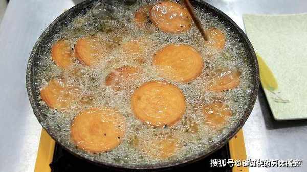 ,油温过高,容易出现外面已经焦糊,红薯泥还不热的情况,小火炸1分钟,炸至饼干颜色变成金黄色,捞出控干油摆放在盘中。