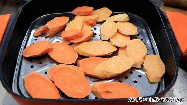 1.首先我们准备一下食材,红薯两块切成红薯片,放在蒸锅内,上锅蒸10分钟。