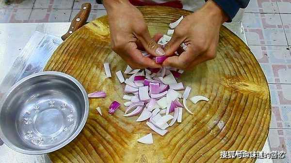洋葱半个先切成宽条,然后用手抓散,你一定要先抓散,要不在炒的时候一大块洋葱在锅内生熟不一致。青线椒两个,斜切成圈,和洋葱放在一起。拿出一个小盆,打入鸡蛋四个,加入食盐1克,然后用筷子快速地打散。