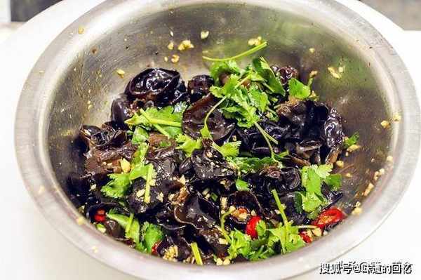 把蒜末、辣椒圈倒入大一点的盆中,加入食盐2克,白糖少许提鲜,味精1克,辣椒红油10克,陈醋10克,生抽10克,芝麻香油5克,倒入木耳颠盆拌匀,加入香菜段,搅拌均匀后即可装盘。