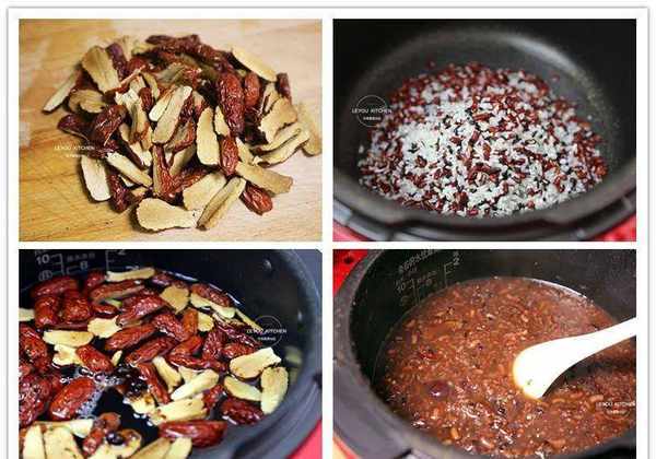 第三步:将红枣和红糖放入锅中,再放入约1200毫升的水,盖上锅盖开始煮粥。如果电饭煲有“杂粮粥”功能,选择“杂粮粥”。如果没有这个功能,记得多煮一会,直到豆子变软。