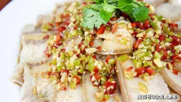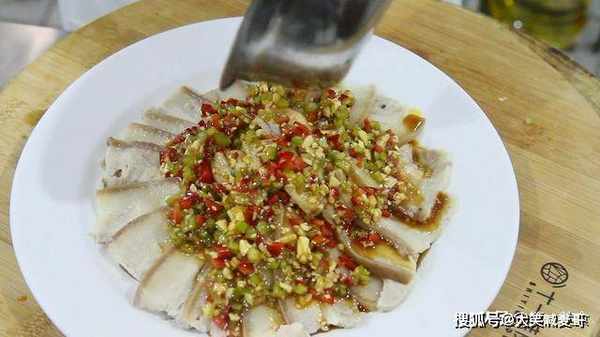 再加入高汤半勺化开调料,最后撒上一小把白芝麻。搅拌均匀后,浇在摆好盘的白肉上面,最后再放上几根香菜。