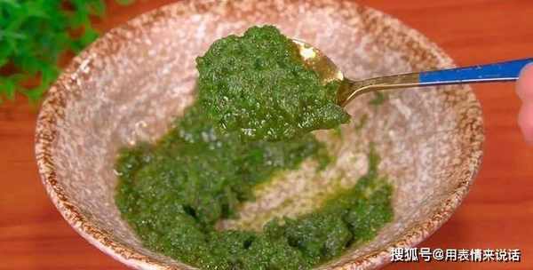 7.下面来调一个蘸料,碗中放一大勺韭花酱,少许芝麻香油,混合搅匀,简单的蘸料就做好了。