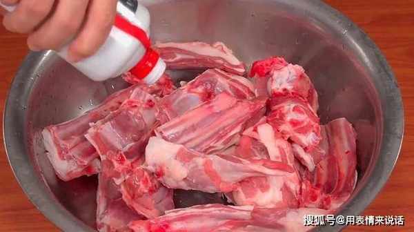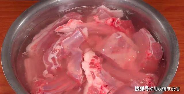 3.放少许高度白酒,适量食盐,以及没过羊排的清水,浸泡1个小时,泡出血水。