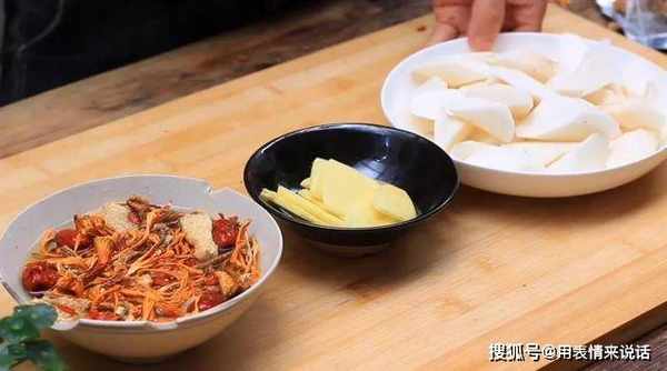 3.准备一些七彩菌菇,用开水浸泡5分钟,再准备一些生姜片、去皮切滚刀块的铁棍山药。