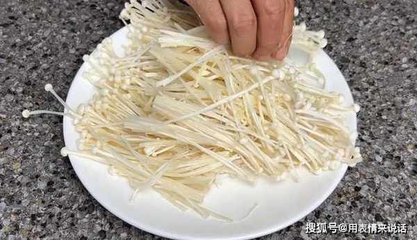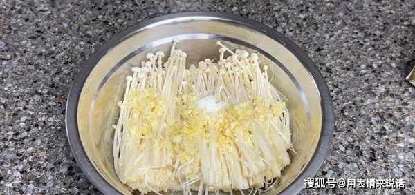 2.金针菇撕成小朵,清洗干净之后,放食盐、食用油、大蒜,混合抓拌均匀。