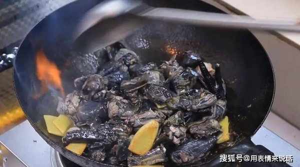 5.接着倒入切好的乌鸡块,开大火煸炒,炒干水分,炒出油水。