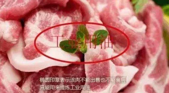 椭圆形印章——也叫“工业油章”,这种猪肉是用来提炼工业油的,一般人不吃,印章是椭圆形的,中间写着“工业油”字样的不要买。