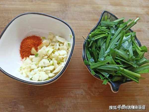 4、切一些蒜蓉、韭菜,再准备一些辣椒面,不爱吃辣的可不放。