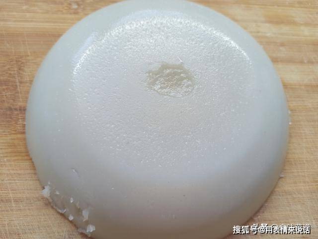 3、随着蒸的时间越久,颜色会变成越深,蒸好之后,等它自然晾凉,这就是我们平常吃的凉粉了,如果想凉拌着吃,可放在冰箱中冷藏,特别的筋道、嫩滑,把凉粉切成块,方便进行下一步。