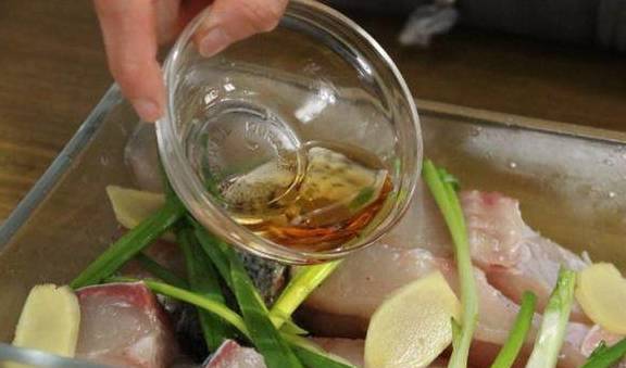 把鱼块放入一个大一点的容器里,倒适量的料酒,加一些葱段和姜片,用手将鱼块揉捏一下,给鱼块腌制一下,要是时间允许,可以时间腌制久一些。