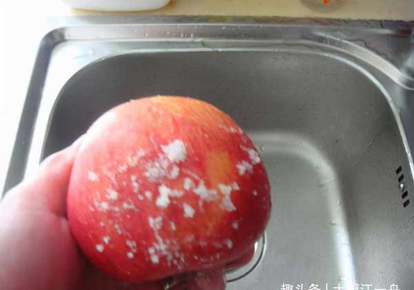 1、先准备一个新鲜的苹果,放入清水中再洗一遍,然后撒上少许精盐。再用手揉几分钟。擦掉苹果表面的蜡。放入清水中,再冲洗一遍,沥干备用。