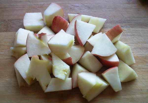 4、苹果切块直接扔进去,再放入处理好的红枣。盖上盖子,用中火炖15分钟。家里有砂锅的话最好用砂锅。这会使粥变稠。