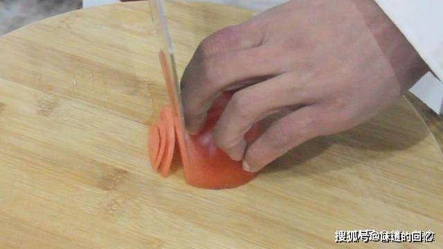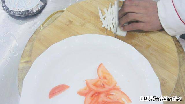 西红柿洗干净,取半个切成薄片。薄片易入味,西红柿片切好以后放在汤盆中,不但能起到点缀紫菜蛋花汤的作用,还能给汤汁入味。