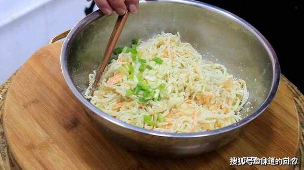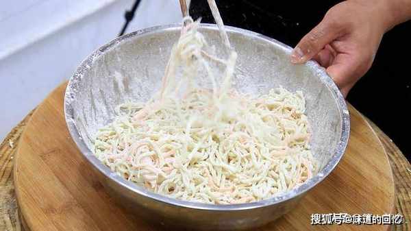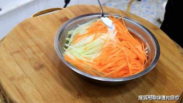 放入食盐2克,使萝卜丝出一下水,然后把萝卜丝倒在笊篱上面,挤一下萝卜里面的水分,用棉布擦干萝卜上面残留的水分,放入盆中。