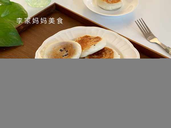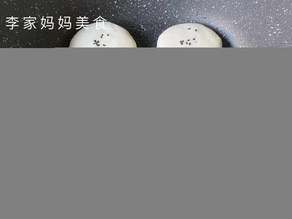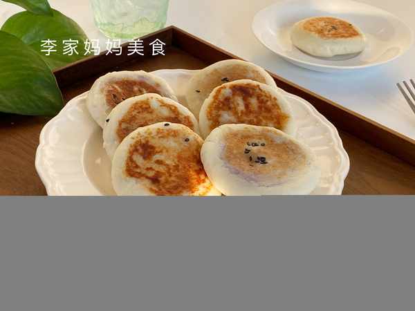 8.平底锅预热,刷一层油,将山药和紫薯肉松饼放入锅中,撒少许黑芝麻,煎至底部变色,再翻面,即可大约5分钟后煮熟。一路都要用小火,多翻几次,防止底部烧焦。