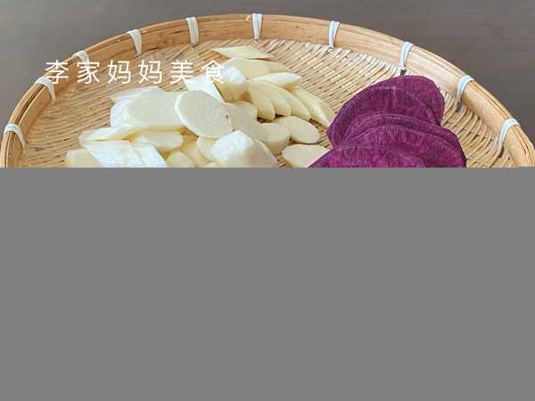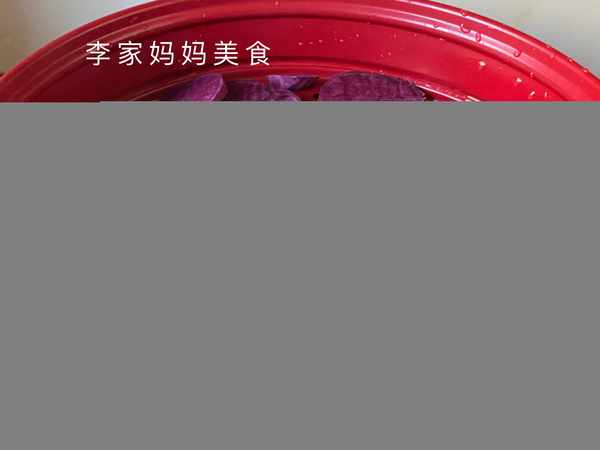 做法:1.这里用的是铁棒山药,口感会更软更甜。山药去皮洗净,切成薄片。紫薯去皮后,切成薄片。剥山药的时候记得带上手套。