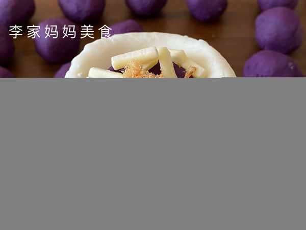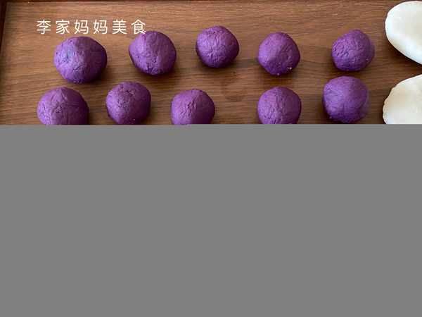 6、紫薯揉成小圆球做馅,山药揉成大挤,然后压成饼状,准备好所有的材料。