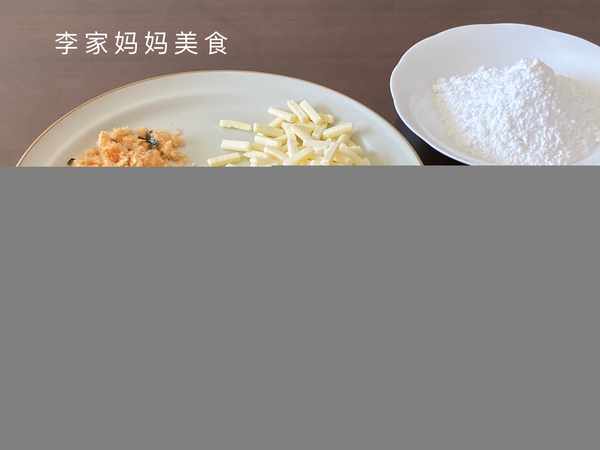 2、准备好材料,糯米粉约60克,肉松和芝士丝适量,在馅料中加入肉松和芝士丝,营养更好,口感更丰富,孩子会更喜欢。