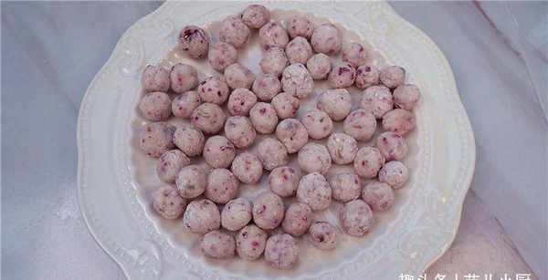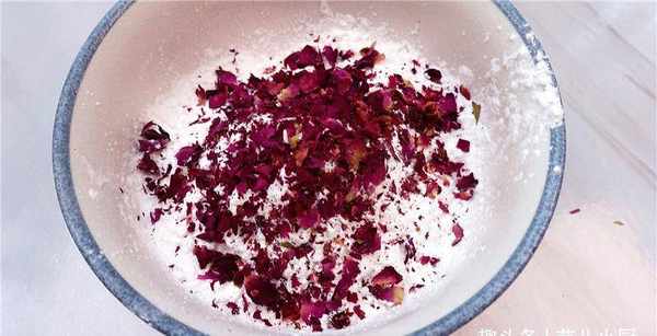 1.将玫瑰花瓣压碎,放入木薯粉中拌匀。
