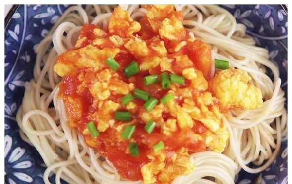 第三步:最后将准备好的面条放入350ml的沸水锅中,大火煮四分半钟,捞出放入碗中,然后铺上准备好的番茄鸡蛋,撒上一些小葱,拌匀马上吃。