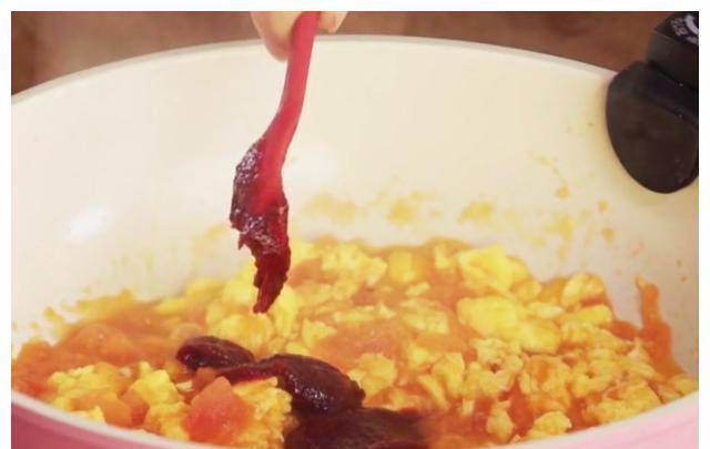 第二步:另起一锅加少许油,将油温的50%倒入切好的西红柿丁,大火炒至熟烂,再倒入煎好的鸡蛋,继续翻炒一个左右分钟,然后加入准备好的甜面酱和番茄酱,加入10毫升水,翻炒煮沸,然后盖上锅盖,转小火炖两分钟,关火备用。