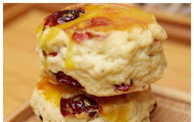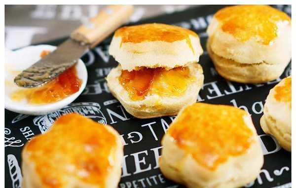 【原料】:低筋面粉150克,泡打粉3克,盐2克,白砂糖15克,固体黄油30克,全蛋1个,蛋黄1个,纯牛奶100毫升,橙子酱3勺。