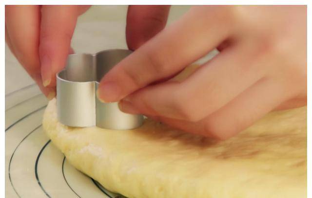 第三步:在面板上撒一层干面粉,把面团放在上面继续揉一分钟。整理成团后压成1.5cm厚的饼状;然后按照下图的操作准备一个制作小蛋糕的定型模具,可以压成好看的形状。