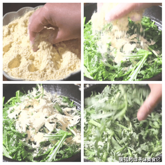 3、将搅拌好的面粉撒在茼蒿上,然后轻轻地用手搅拌均匀。