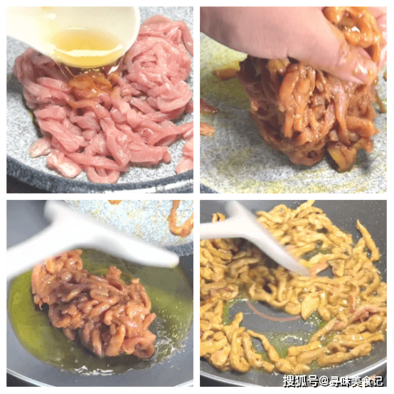 2、锅中放入一大勺油热之后转小火将肉丝儿下入锅中,肉丝炒熟炒散之后捞出备用。