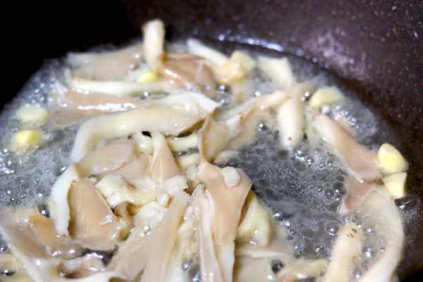 2、锅中放入植物油,烧热之后,放入蒜末把它爆香,把平菇放进去进行翻炒,炒软。
