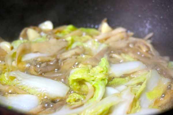 所需食材:平菇少许、白菜半颗、蒜末、植物油、盐2克、酱油半勺