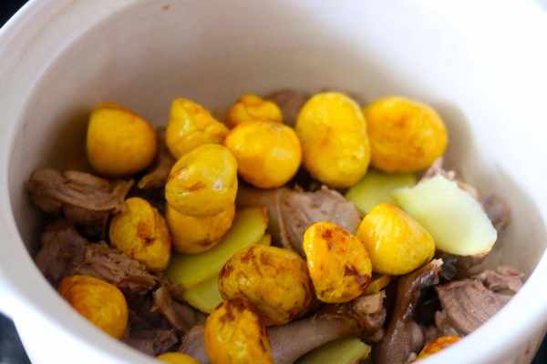 所需食材:麻鸭半只、板栗200克、姜丝、植物油、盐、料酒、鸡粉